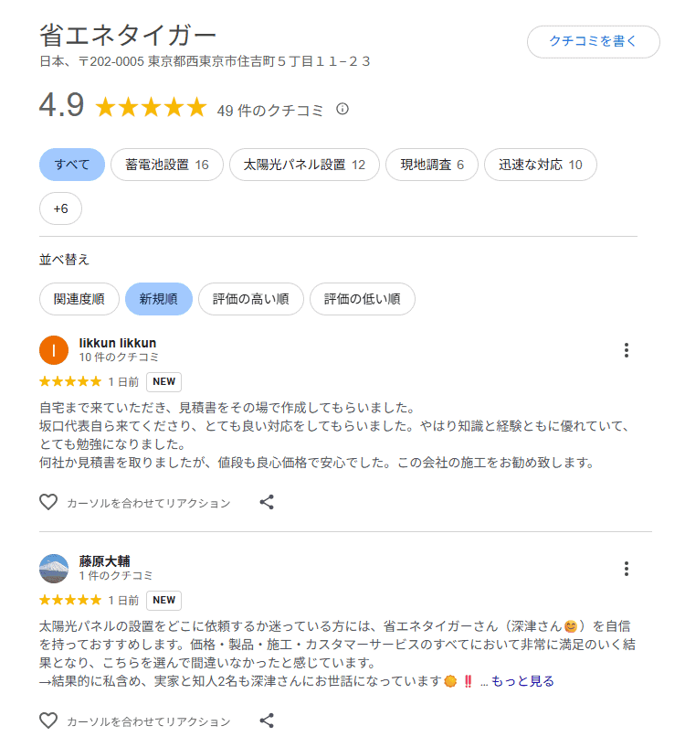 省エネタイガーの信頼性の高さを裏付けるのが、Googleの口コミ評価★4.9という数字です。