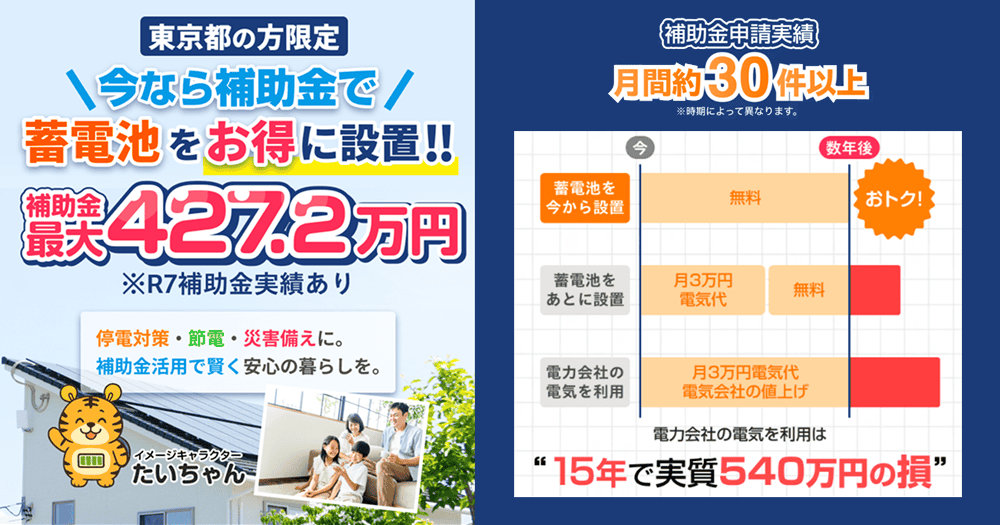 東京都の補助金太陽光+蓄電池セット導入▲1,100,000円