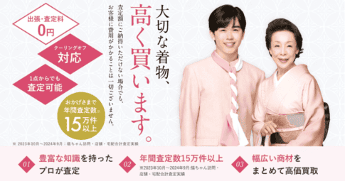 着物買取業者創業58年の老舗!小物までまとめて売りたい人にオススメ! オススメ度 対応エリア 着物専門の査定員 ★★★★★ 日本全国 あり 対応の速さ 代金 買取の方法 ○ その場で受取り 出張買取 宅配買取 持込買取